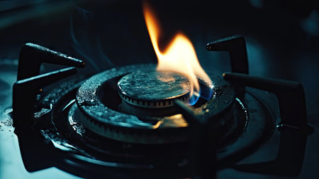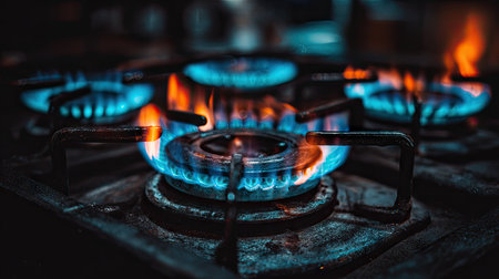 A striking close-up image of a gas burner flame on a modern kitchen stove, showcasing vibrant blue flames against a dark background, ideal for culinary themes.