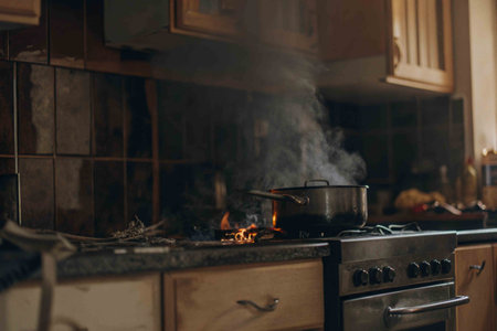 pot is burning on the stove in the kitchen. Fire safety