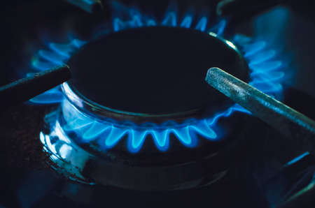 Burning gas at home kitchen stove, close-up of blue flames, dark toned photo