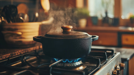 A pot simmers on a gas stove, surrounded by kitchen utensils and warm light illuminating the room as steam gently rises into the air.