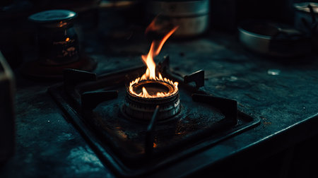 Flames flicker gracefully from a gas stove, highlighting intricate surfaces and textures in a rustic kitchen bathed in warm, inviting light.