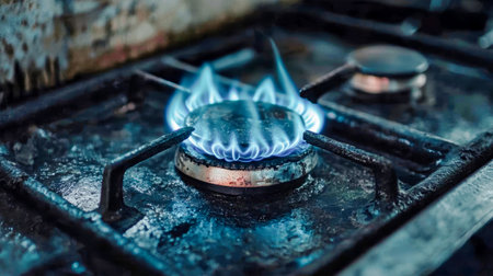 Blue flames flicker on a gas stove in a cozy kitchen, highlighting the intricate details and warm ambiance created by natural lighting.