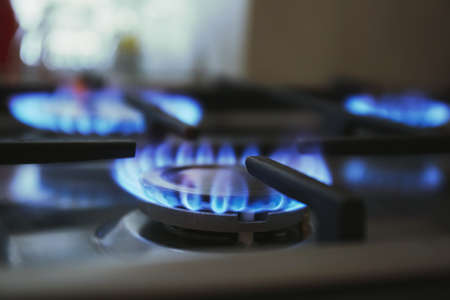 Close-up shot of gas flames burning from a kitchen stove. Natural gas, energetic crisis