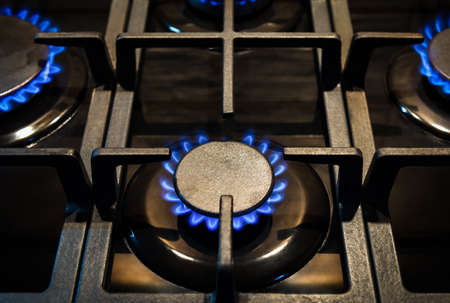 Gas burners with blue flame on stove, closeup