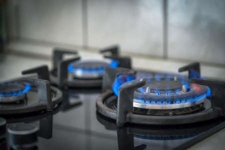 Modern kitchen stove cook with blue flames burning.