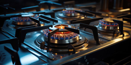 Close up of a modern kitchen gas stove with glowing burners, warm lighting, and a cozy kitchen atmosphere Perfect for cooking, home, and culinary themes