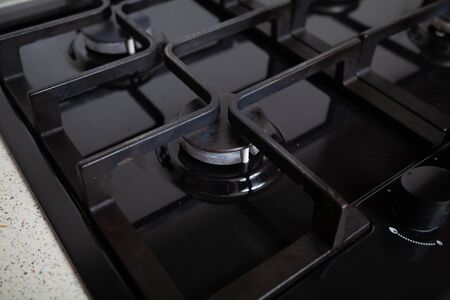 Kitchen gas stove, close up. New gas stove appliance and countertop surface at modern kitchen. Modern kitchen stove cook.