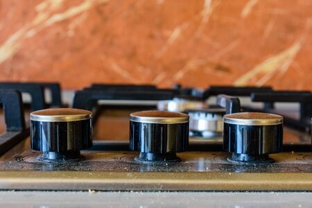 Chrome plate of gas cooker. Four control knobs. Kitchenware. Comfort