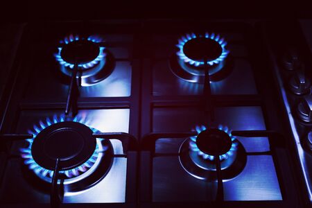 Burning gas at home kitchen stove, close-up of blue flames, dark toned photo