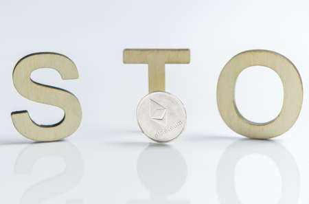 Security Token Offering STO sign with wooden letters and silver Ethereum coin, Ethereum concept on white background