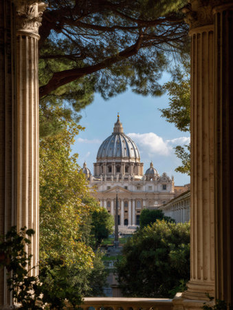 Stunning view of the Vatican framed by lush trees and ancient columns, showcasing the iconic dome under a clear blue sky in a serene setting.