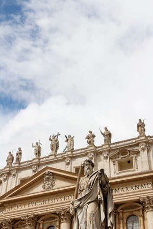 Statue of St. Paul with sword in front of St Peter's Basilica with blue sky and clouds in Vatican City, Rome, Italy