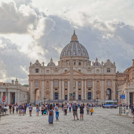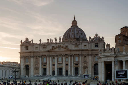 ROME, ITALY - SEPTEMBER 23, 2015 : Front view of St Peter's Basilica in Vatican with people around, on cloudy blue sky backgroundat sunset time.