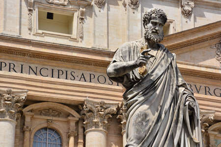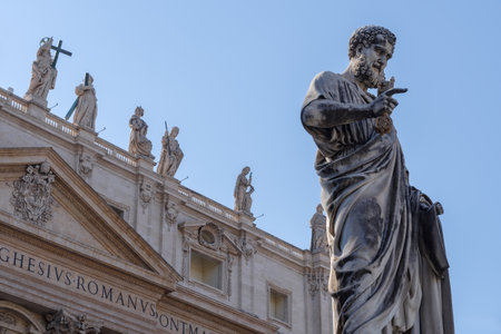 Statue of apostle Peter in front of facade of Saint Peter's Basilica in Vatican, Italia.