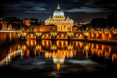 St. Peter's Basilica in Vatican at night, Rome, Italy. Generative AI