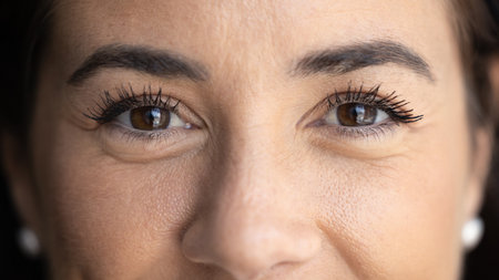 Macro photo close-up of female brown eyes. Middle-aged European, clear skin, thick eyebrows, wrinkles around the eyes.