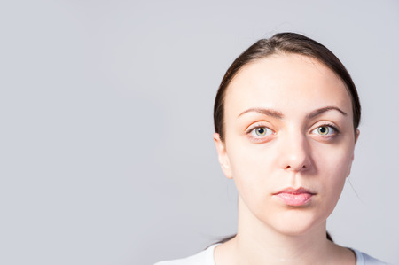 Close up Serious Face of a Young Woman Looking at the Camera Against Light Gray Wall with Copy Space.
