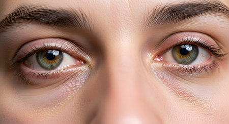 A detailed macro shot of a woman's green eyes, showing puffiness and dark circles under the eyes. The image focuses on the texture of the skin, eyelashes, and eyebrows, representing concepts like fatigue, aging, stress, or the need for skincare.