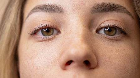 Close up portrait of a beautiful young woman with brown eyes looking at camera