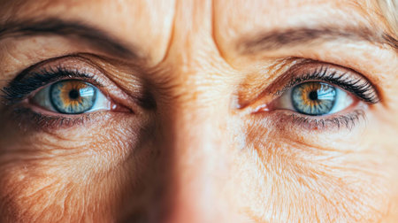 Close up of an elderly woman s expressive blue eyes reflecting wisdom and life experiences, with fine lines and natural beauty in soft lighting