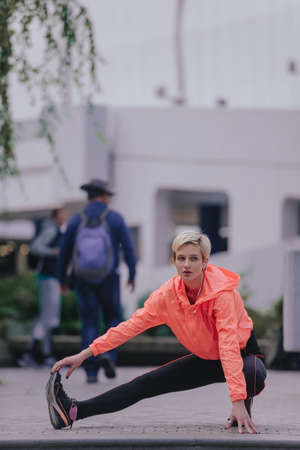 Beautiful athletic female in sportswear is stretching legs and looking at her leg in the street