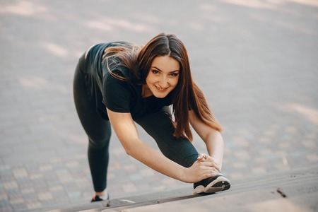 Attractive and strong woman stretching before fitness in the summer park. Sports concept. Healthy lifestyle.