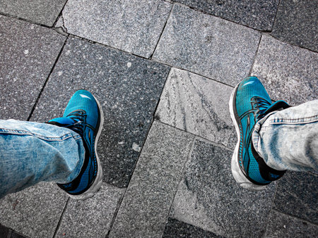 Legs in gray lace-up sneakers and blue jeans standing on the asphalt, top view.