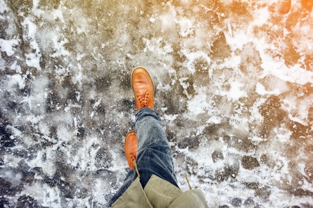 Male legs in leather boots standing on cracked ice, top view