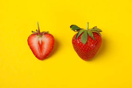 Strawberry pattern red ripe sweet on yellow background view from the side