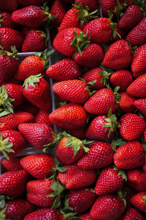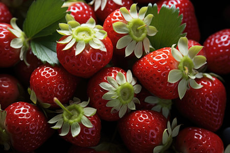 A captivating arrangement of fresh red strawberries showcases their vibrant color and juicy texture, perfect for culinary, health themes, or seasonal delights.