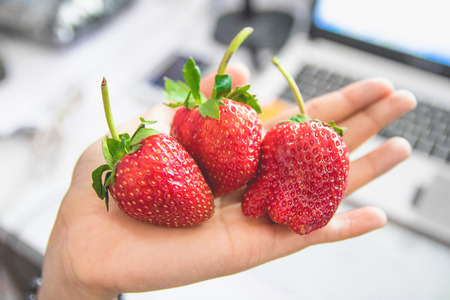A big strawberry in young girl hands on office background in soft tone mood. Big red fruit in winter season sweet and sour taste.