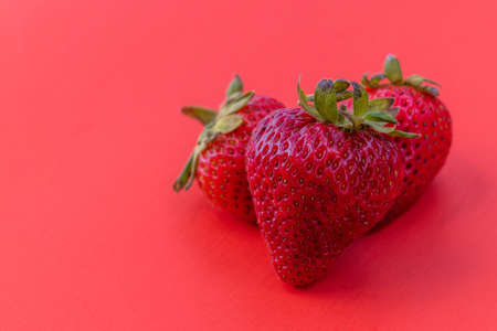 Arrangement of juicy strawberries on a vibrant red background, with a single berry placed in the center