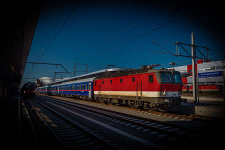Red electric passenger train in Graz station in summer sunny fresh morning