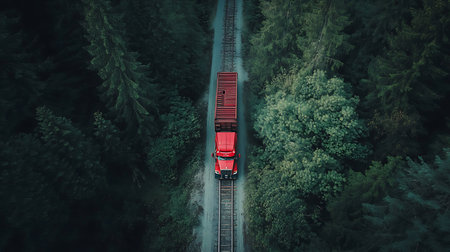 Aerial perspective showcases a red freight truck transporting cargo on railway tracks, with a thick forest enveloping the transportation route, offering a scenic yet industrial view.