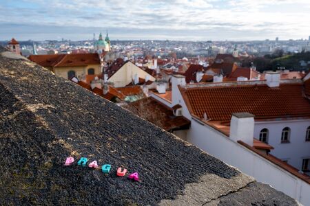 The view over the red roofs of Stare Mesto district in Prague, Czech Republic, from the view point on top of the tower of the Charles bridge in winter