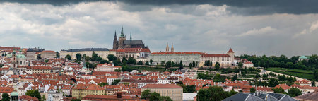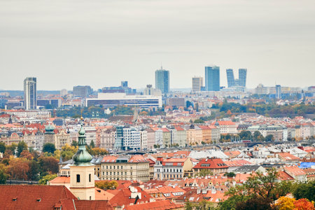 Panorama of Prague, Czech Republic, seen from the top of the castle, during an autumn cloudy afternoon. Major tourist landmarks such as medieval towers, cathedrals and churches, are visible.