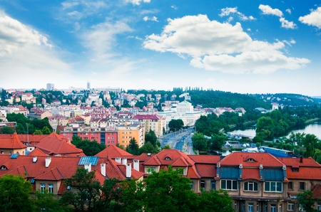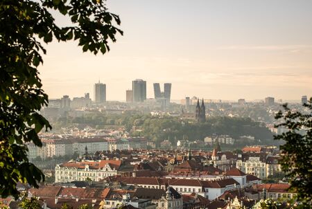 The Prague panorama. The panoramic cityscape of Czech Republic capitol on a sunny day. The detail view of modern and old part of town with traditional red rooftops.
