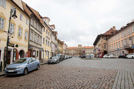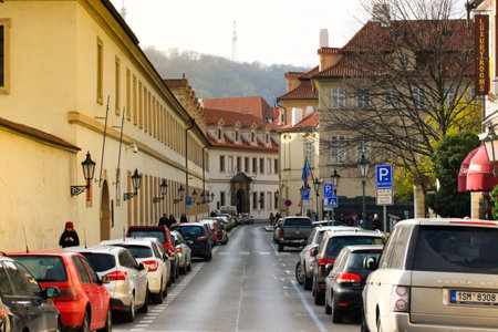 Prague, Czech Republic. November 2020. A street in a European city with parked cars along a roadway going into a distance. Old architecture, houses with tiled red roofs in the town on a sunny day.