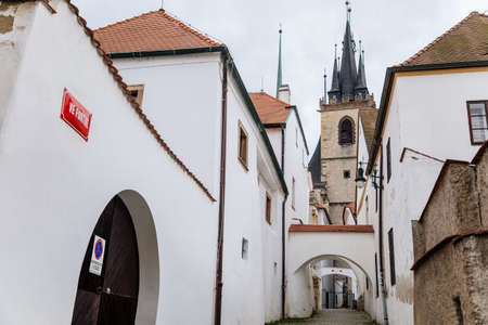 Louny, Czech Republic, 19 September 2021: Narrow picturesque street in historic center in medieval city, spire gothic tower of St. Nicholas church at autumn day, white town buildings, arched passage