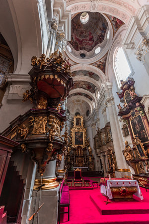 PRAGUE, CZECH REPUBLIC - MAY 4, 2024: Interior of Basilica of the Assumption (Czech: Bazilika Nanebevzeti Panny Marie) in Strahov Monastery in Prague, Czech Republic.