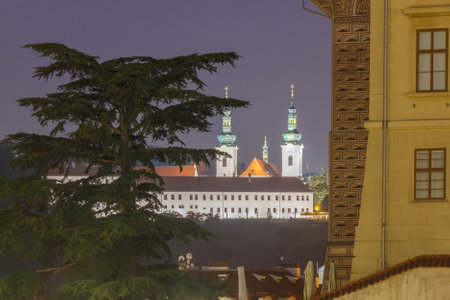 Prague, Czech Republic - October 1, 2014: View of the Strahov Monastery at night from the central square of Prague Castle.