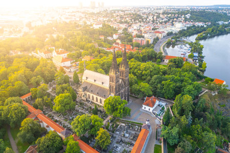 Vysehrad Basilica of St. Peter and St. Paul stands proudly in Prague, bathed in the warm glow of the sunrise. The surrounding greenery enhances its architectural beauty, creating a picturesque scene.