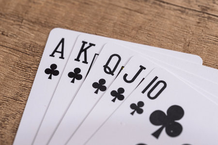 flush royal combination cards lying on a wooden table