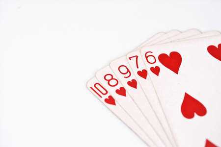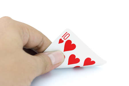 Closeup photos that focuses on the ten card of heart in the hand on white background