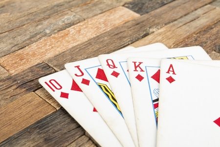 Poker cards, Royal flash on wooden background. Macro shot.