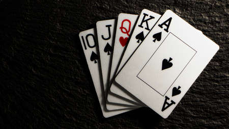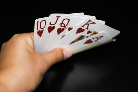 Horizontal shot of Royal flush on a black background. Playing card in soft focus. The concept of victory.