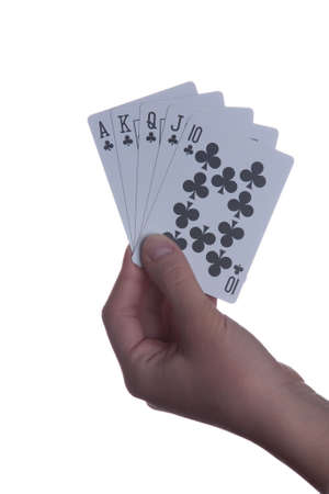 Hand with Royal Flush cards isolated on white background.