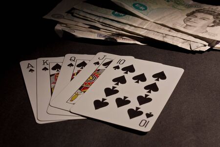 A royal flush poker hand and a pile of British banknotes