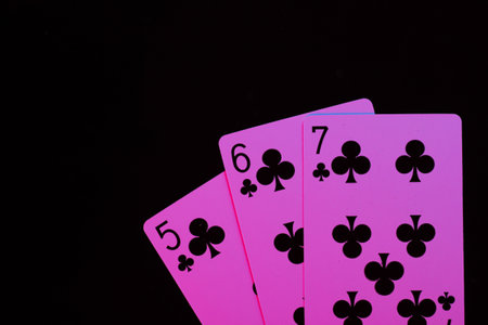Playing cards in neon pink light on a black background. Game addiction. Poker