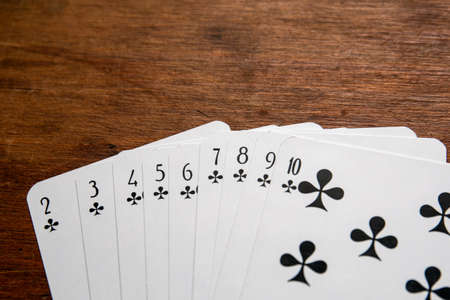 Set of Clubs suit playing cards on wooden desk